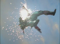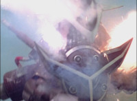 The cockpit bursts around Silverhead, his Robot then bursting with sparks and smoke. Deltamax Megazord turns about face as Silverhead's Robot collapses and explodes massively. |