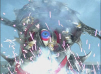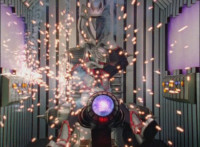 Omegamax Cycle fires lasers forth, bursting Amoeba's Robot. |