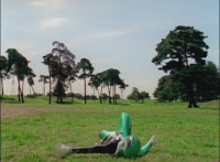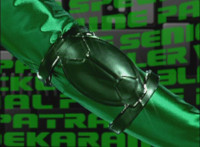 Green turns around and gets sparkily slashed by the Orangehead until he flips over. Orangehead turns and stands there as Gineka comes over to him and talks to him, patting him on the shoulder, then joining his fellow aliens in racing away. Green gets up and reacts to their retreat, when suddenly, he looks up to see multiple Orangeheads and Blueheads flipping onto the scene! Green finds himself facing 4 Blueheads and 3 Orangeheads. The Krybot variants race forth and attack, prompting Green to defend himself, soon overwhelmed, when Red leaps in and fires his Blasters, bursting some of them. He lands, fires some more, they burst some more. Green sparkily beats an Orangehead away, as his teammates regroup around him. Green nod-talks to Red, then Blue. |