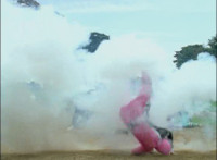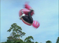 Bursts erupt before the six Rangers, but Pink dives through the smoke. |