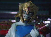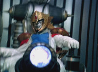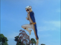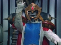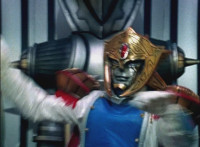 Silverhead falls, smoking, as he looks forth and sees the Rangers regrouping, Yellow & Pink posing. He gets up talking weakly, points, then touches his left wrist, and leaps up, landing in his Gladiator Robot as it dematerializes in the city. Once in the cockpit, Silverhead slaps his hands together, then makes his Robot pose. The Rangers gawk, Green talking to Yellow, then Pink reaches for her Delta Morpher. |