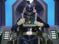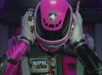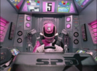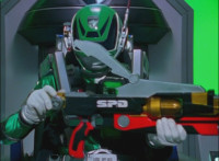 As Gineka's spacecraft approaches, SWAT Megazord flips over it and lands a heel kick so hard the craft reverts to Robot mode, shaking up the cockpit, as it falls to the ground. SWAT Megazord touches down and poses as Gineka's Robot recovers. Red punches fist to palm, Yellow nod-talks, Pink clutches both sides of her helmet, Blue speaks calmly, before the other four Rangers in their cockpits cut in on him, an arm across each chest. SWAT Megazord jets forth, grabs Gineka's Robot, and hauls it overhead into space, just above the Earth's atmosphere, flinging it away, then transforming into SWAT Flyer Cannon mode. Green nod-talks, then pulls out his Delta Enforcer and opens it up. |
