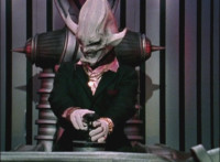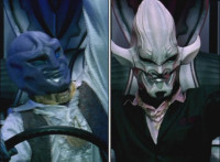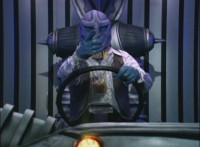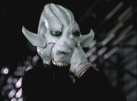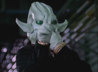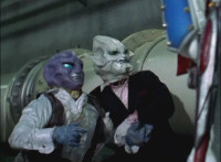 Gineka, Chiaggo, and Delapoo cease running to our left, and turn to our right, as Green stands there, talking. Gineka taps his blaster to his hand and speaks, Green responding during a push-in, then a quick shot of the alien trio. |