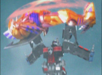 The spacecraft circles around and fires down upon the Deltamax Megazord burstingly. |