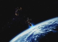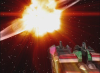 A trigger is pulled on a Delta Enforcer, and the SWAT Flyer Cannon fires its twin barrels forth, striking Gineka's Robot, exploding is tremendously, spark bursting Gineka in the cockpit, as the Robot finishes blowing up so much it sends out a shockwave. The five Rangers lower their Delta Enforcers and give a group thumbs down. The SWAT Megazord, now suddenly back in formation, poses while floating just above the Earth. |