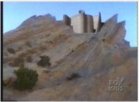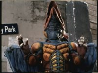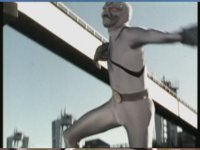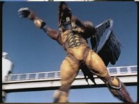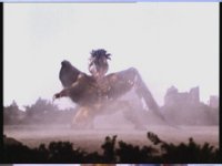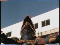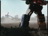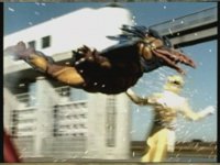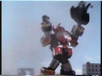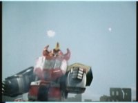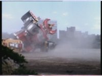 Pan up from Megazord's stumbling-back feet, as it staggers off in front of what looks like disused buildings. |