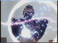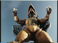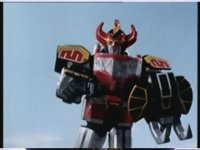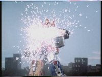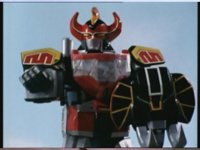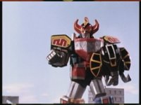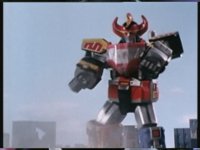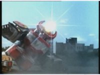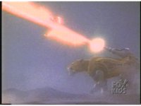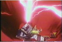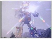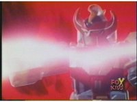 Megazord, on its left side, motions to head with arm, and unleashes a whitish yellow beam from its horn. |