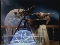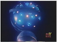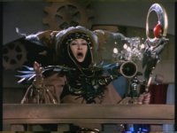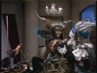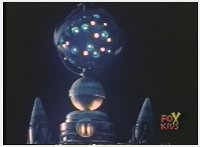 Alpha stands in the Command Chamber, looking at the Viewing Globe at our slight left, motioning arms excitedly in response to what he sees, before turning and talking up to Zordon. |