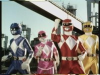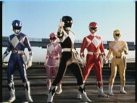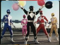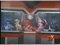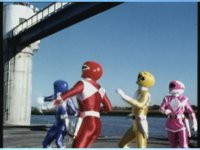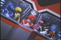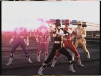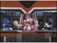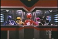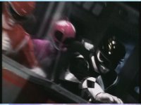 Zoom out from Red, as all five Rangers in cockpit raise right arms and make slashing downward motion. |