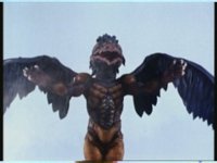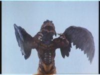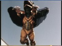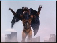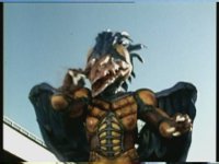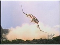 Pterodactyl Dinozord flies at us, just over a valley, doing an aileron roll, kicking up dust in its wake. |