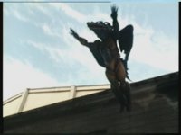 Peckster leaps backward onto the edge of the roof via the power of footage reversal. |