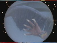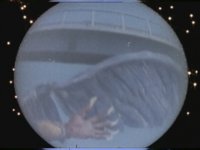 Rita, her back to us, stands at balcony railing, facing the cut-out of Earth. She leans back and extends both her arms toward the planet, slowly. |
