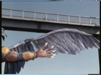 Zoom out and pan right as Peckster spreads arms and pops out his left wing to its full span. |