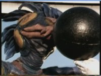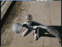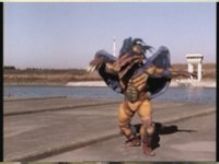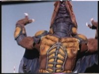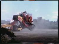 Continued from two shots ago, the left-side laying Megazord flops onto chest, then hoisted itself back to its left side. |