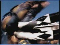 Red Ranger in cockpit, zoom in as he presses controls forth. |