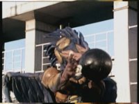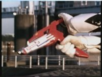 Megazord poses battle ready against the wind coming at it from our left, then using the shield to block it. |