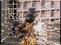Continued from two shots ago, Megazord's chest spark-bursts one final bright time as it just finishes its backwards blow across the scene. |