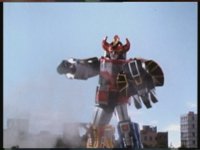 Zoom out as Peckster falls and rolls across battlefield, a Megazord steps into frame and looms. |