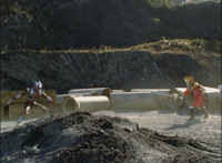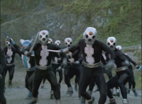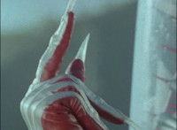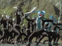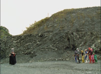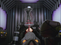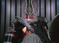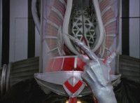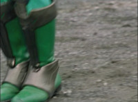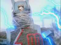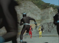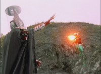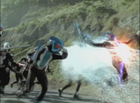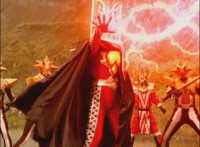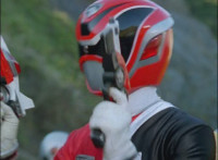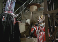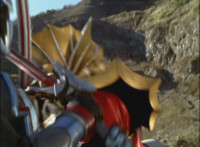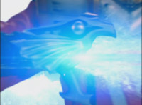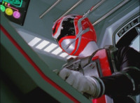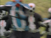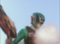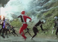 Shadow steps in front of the other Rangers and nod-talks as shot pushes in on him, then quick shots of each Ranger's helmeted head. Broodwing reaches forth and fires red electricity bolt at the team, brusting in front of them, but they rush through the smoke unscathed. Krybots, Blueheads, and Orangeheads scramble forth. |