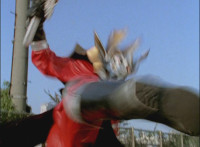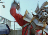 Trimmed to remove him raising it; US replaces surrounding Green & Pink vs Icthior sequence due to different SPD vehicle behind them. |