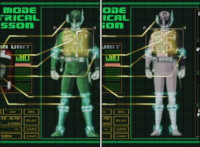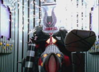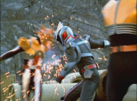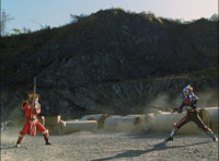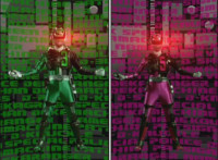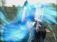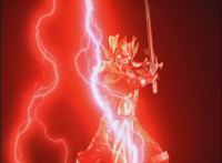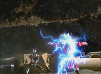Omega slams his left hand down onto the ground, sending a surge of electricity into the Krybots and Blueheads ahead of him, knocking them down. Shadow slashes sparkily through Orangeheads, until they all crackle and collapse. Icthior suddenly leaps in and slashes at Shadow, who dodges and poses defensively, the pair exchanging words while remaining posed with their Sabers forth, until Shadow holds his horizontally. |