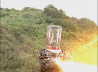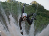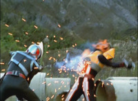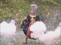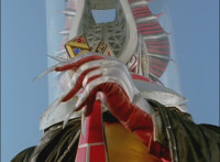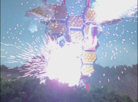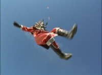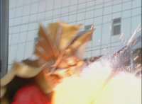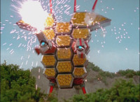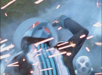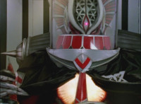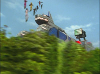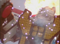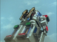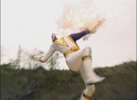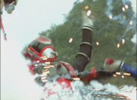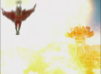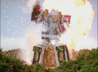 Broodwing's Robot & Delta Command Megazord continue to pour energy at one another, until finally the Megazord's power overwhelms that of the Robot, bursting Broodwing in his cockpit. The Robot crackles and explodes massively, as Broodwing flies to safety. |