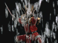 Shadow finishes motioning and poses with saber as flames ignite around him, then moves forward. |