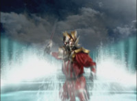 Icthior raises his Ocean Saber into the air, a crackling of red crashing around him as he poses with it, then water flows in front of him, and he races forth. |