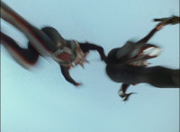 Trims start to remove Orangehead accidentally slashing a Bluehead; cuts follow-up side angle shot that shows the damaged Bluehead on the ground; laser effects added. |