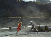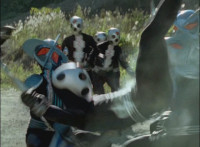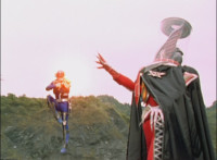 Broodwing whips open his cape and fires off a swirling energy from his armpit, bursting the six Rangers down. Elsewhere, Shadow & Icthior clash blades repeatedly, locking them, then breaking off for a moment. Shadow talks while raising his Saber up. |