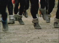 Cuts follow-ups of Robot marching forth a few steps then stopping. |