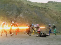 Orangehead bursts down. Yellow slashes her way over to Red, getting back to back with him and the pair have a brief conversation. More Krybots charge forth, when Pink, Blue, and Green leap in and fire upon them, bursting the footsoldiers. The Rangers regroup, Red talking to Blue, then Yellow talking to Pink, who speaks, before Blue also replies. Blueheads burst into the air, a Krybot dirt bursted into flying forth, as Omega flips in and lands next to Red, talking to him. Green speaks. |