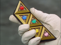 Icthior replies, then rushes forth, where they clash blades once again, soon ending up locking Sabers, where Icthior uses his sea-vomit attack, but Shadow is able to dodge it. They clash blades once more, before Shadow upslices, sending the Ocean Saber flying, before sparkily slashing Icthior and sending him flying into some crates explosively. Nearby, the other six Rangers scramble forth, Omega leaping up, only to get zapped down sparkily by Broodwing. Blue & Green, then Yellow & Pink, leap up and fire upon Broodwing, who shields himself from their bolts with his cloak. Broodwing stands there, open for Red to fire his Delta Enforcer at him, bursting him so hard he loses hold of the Rangers' badges. The six Rangers catch the badges, Red looking at Doggie's, then holding it forth. Meanwhile, Shadow poses as Icthior smokes and clutches his gut, pointing and talking. Shadow readies his Saber, then charges it up and slashes the extended energy blade forth at Icthior, slicing through him with an energy impact. |