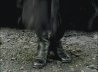 Push in on Broodwing, as he points, then holds the badges up in front of his face, before whipping his cloak about and taking flight. |