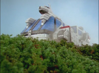 The Delta Command Crawler rolls through the forest, so the seven Rangers leap up and into it. |