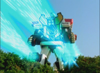 Delta Command Megazord fires lasers from its fingertips forth. |
