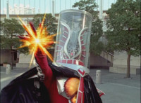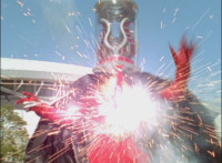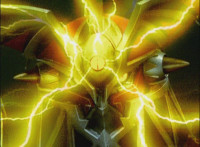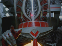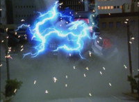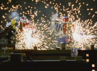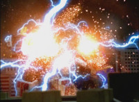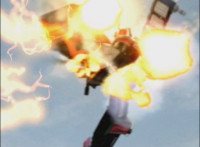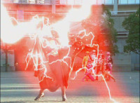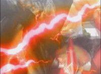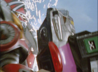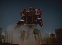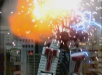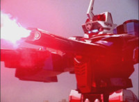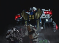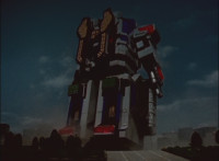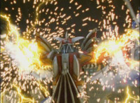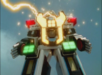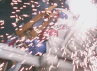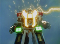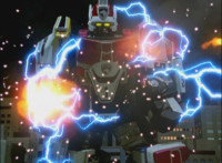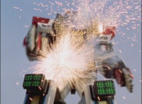 Slight zoom out as A-Squad Megazord fires another jolt of electricity from its forehead. |