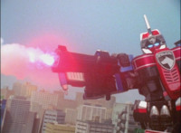 Delta Command Megazord charges up its chest plates during zoom in, and soon releases a beam of energy to our left. |