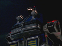 SWAT Megazord soars in, all Superman-esque. Delta Command Megazord looking upward. |