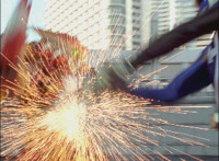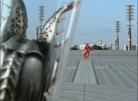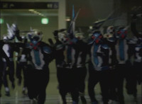 Cuts prior additional kicking shot, then cuts follow-ups of SWAT Megazord kicking A-Squad Megazord back repeatedly. |