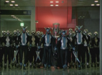 A bunch of Blueheads lead an army of Krybots up the stairs at the Delta Command Base, pan left across the approaching swarm of robots. |