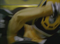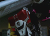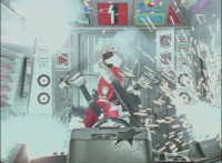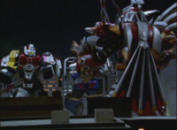 Cuts before it calms down and he talks; cuts follow-ups of A-Squad Megazord sparkily bashing both Megazords in the chest at the same time. |