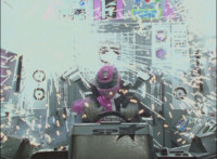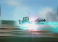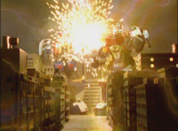 Comic panel lines added between each cockpit; cuts follow-ups of SWAT Megazord turning into Cannon Mode, Omegamax Megazord firing it into A-Squad Megazord point blank, taking it out and a building behind it. |