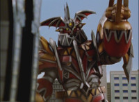 Delta Command Megazord finishes standing up, and stands completed. Broodwing is inside the cockpit, along with Crabhead, the ingeniously named Monster #1, and the bravely named Monster #2. |