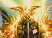 A-Squad Megazord spreads arms and releases a golden wave of energy from its chest at Delta Squad Megazord, crackling and bursting not only it, but each of its five cockpits. Delta Squad Megazord crackles, bursts, and slowly collapses forth. |