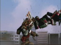 Delta Command Crawler's back cannons fire, bursting both Delta Squad & Omegamax Megazords explosively, agonizing the six Rangers within. |