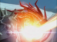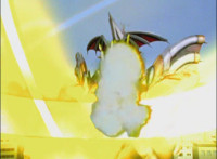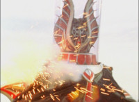 Delta Squad Megazord's broken saber tip flies into the air. |