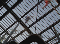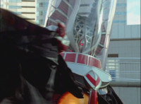Omegamax Cycle races up Delta Command Megazord's back and into the sunny sky, with the five SWAT Mode Rangers diving down from within it in midair, landing upon the Delta Command Megazord's shoulder, as it turns to look at them. Red speaks quickly, before they race off, Broodwing talking during zoom in. The five Rangers race forth over us on the catwalk. |