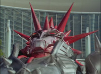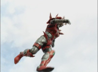 Monster #2, Crabhead, and Monster #1 all fall down beside Broodwing. The other Rangers leap in and regroup with Red, facing the four alien criminals. Pan left and zoom in on Red as he talks. |