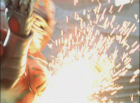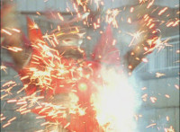 Cuts final shot before A-Squad Megazord strikes Delta Squad again; then cuts follow-ups of A-Squad fighting the two Megazords, sparkily striking each one until it hits Delta Squad's saber explosively. |